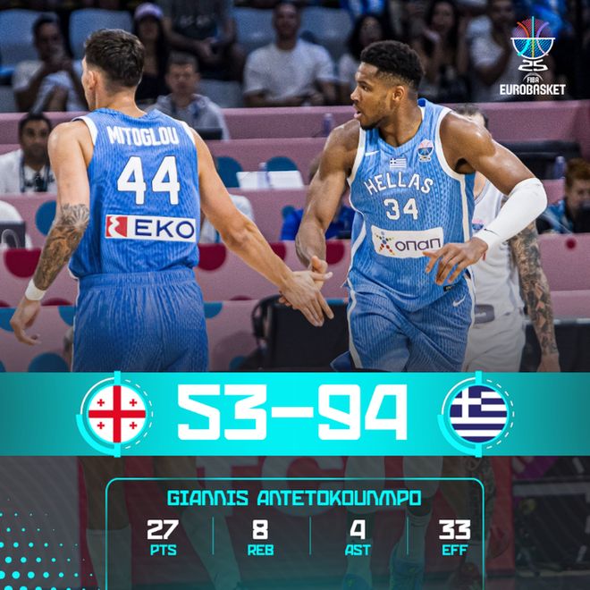 晋级欧锦赛16强!字母哥复出27+8 希腊男篮41分大胜格鲁吉亚